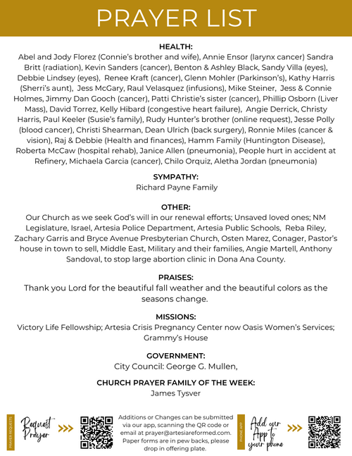 Praying for everyone to have a wonderful week, please post additions or changes here, to prayers@artesiareformed.com or in the application prayer board.