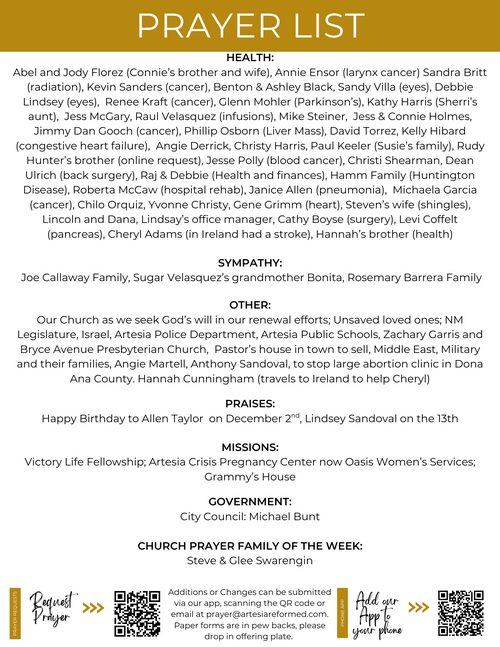 This weeks prayer list and order of service, for events please look at events tab on website. Reminder no Tuesday night and Wednesday night meetings until after first of the year, we do have a weekly event planned.